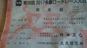 「第36回2017多摩ロードレース(10kmの部)」に参加❣ishikawa2017-03-26T19:52:25+00:00 3月26日(日)午前、今日は地域の皆さんと一緒に「第36回2017多摩ロードレース(10kmの部)」に参加しました!あいにくの雨と練習不足ではありましたが、何とか無事に完走することができました。また、雨の寒い中、小さいお子さんからご年配の方まで、沿道で応援をいただきありがとうございました!また、お知り合いの方が60歳以上の部3位に入賞されたとのことで、凄すぎです!皆さまお疲れ様でした。