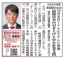 タウンニュース多摩区・麻生区版に県政報告Vol.60「最低賃金の引き上げ途中小企業支援」 を寄稿!石川ひろのり2025-10-09T10:42:16+00:00 10月3日(金)、本日発行のタウンニュース多摩区・麻生区版に県政報告記事 かながわ未来県政報告Vol.60「最低賃金の引き上げ途中小企業支援」 を寄稿しました。この質疑の模様は10月8日(水)tvkデジタル3chにて放映予定です。ぜひご覧いただき、ご意見・ご要望お寄せ下さい。過去の掲載記事は下記アドレスをクリックして下さい。 http://www.hiro-ishikawa.jp/town-news/