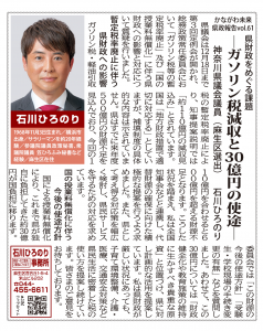 12月19日(金)、本日発行のタウンニュース多摩区・麻生区版に県政報告記事 かながわ未来県政報告Vol.61「 ガソリン税減収と30億円の使途 」を寄稿しました。ぜひご一読いただき、ご意見・ご要望お寄せ下さい。過去の掲載記事は下記アドレスをクリックして下さい。