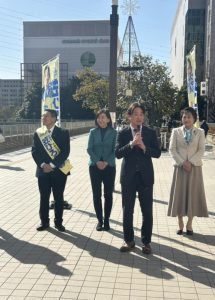 1月27日(火)日中、新百合ヶ丘ペデストリアンデッキで行われた笠ひろふみ衆議院議員候補の出陣式に出席。県議会議員に選出いただく前、笠ひろふみさんの秘書を務めさせていただきました。その頃も含め、4,200回を超える駅頭・街頭活動を地道に誠実に積み重ねてこられました。9期目の挑戦となる今回の選挙に向け、必勝を願い応援メッセージをお伝えしました。