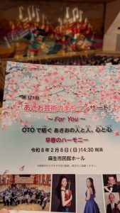 2月8日(日)午後、ご案内をいただき麻生市民館で開催された「第171回 あさお芸術のまちコンサート」に伺いました。第1部は、公募合唱団と出演者によるジョイントで「乾杯の歌」を披露され、華やかなオープニングに。その後は、フルート四重奏やヴァイオリン、ピアノ演奏など心地よい音楽を聴かせていただきました。短い時間ではありましたがゆったりとしたひとときを過ごさせていただきました。